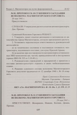 Протокол № 11 суженного заседания исполкома Магнитогорского горсовета. 29 мая 1941 г.