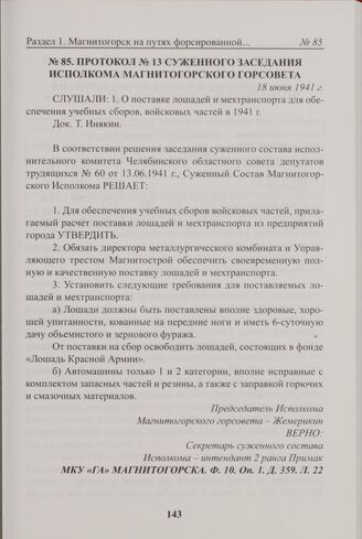 Протокол № 13 суженного заседания исполкома Магнитогорского горсовета. 18 июня 1941 г. // МКУ «ГА» Магнитогорска. Ф. 10. Оп. 1. Д. 359. Л. 22.