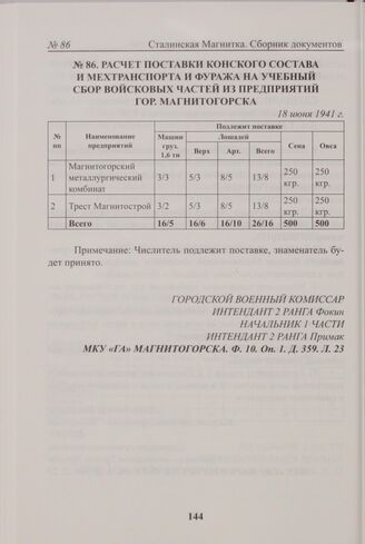 Расчет поставки конского состава и мехтранспорта и фуража на учебный сбор войсковых частей из предприятий гор. Магнитогорска. 18 июня 1941 г. // МКУ «ГА» Магнитогорска. Ф. 10. Оп. 1. Д. 359. Л. 23.