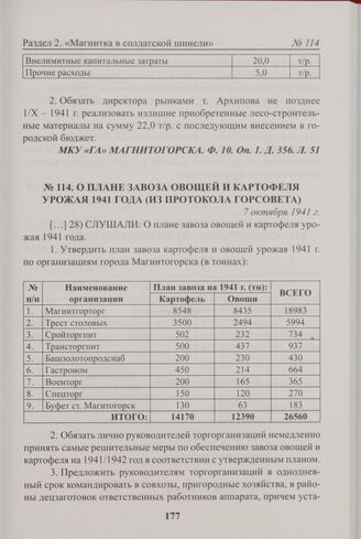 О плане завоза овощей и картофеля урожая 1941 года (из протокола Горсовета). 7 октября 1941 г. // МКУ «ГА» Магнитогорска. Ф. 10. Оп. 1. Д. 357. Л. 119.