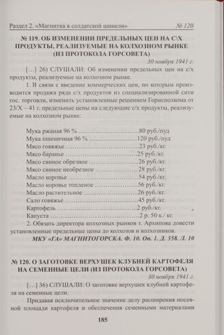 Об изменении предельных цен на с\х продукты, реализуемые на колхозном рынке (из протокола Горсовета). 30 ноября 1941 г. // МКУ «ГА» Магнитогорска. Ф. 10. Оп. 1. Д. 358. Л. 10.
