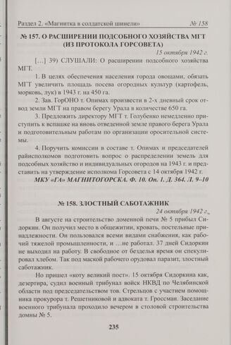 О расширении подсобного хозяйства МГТ (из протокола Горсовета). 15 октября 1942 г. // МКУ «ГА» Магнитогорска. Ф. 10. Оп. 1. Д. 364. Л. 9-10.
