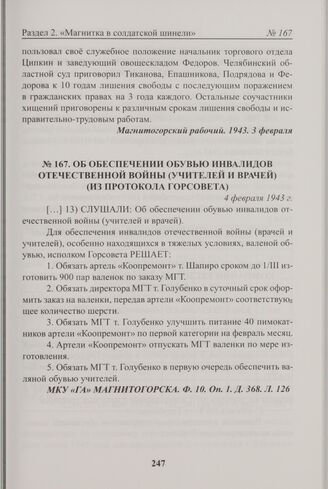 Об обеспечении обувью инвалидов отечественной войны (учителей и врачей) (из протокола Горсовета). 4 февраля 1943 г. // МКУ «ГА» Магнитогорска. Ф. 10. Оп. 1. Д. 368. Л. 126.