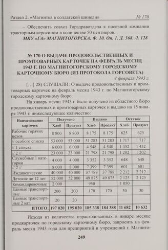 О выдаче продовольственных и промтоварных карточек на февраль месяц 1943 г. по Магнитогорскому городскому карточному бюро (из протокола Горсовета). 4 февраля 1943 г.
