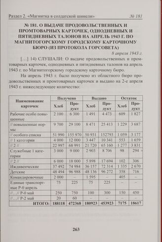 О выдаче продовольственных и промтоварных карточек, однодневных и пятидневных талонов на апрель 1943 г. по Магнитогорскому городскому карточному бюро (из протокола Горсовета). 8 апреля 1943 г. // МКУ «ГА» Магнитогорска. Ф. 10. Оп. 1. Д. 369. Л. 118.