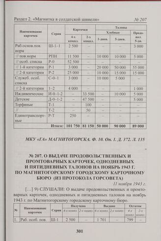 О выдаче продовольственных и промтоварных карточек, однодневных и пятидневных талонов на ноябрь 1943 г. по Магнитогорскому городскому карточному бюро (из протокола Горсовета). 11 ноября 1943 г.