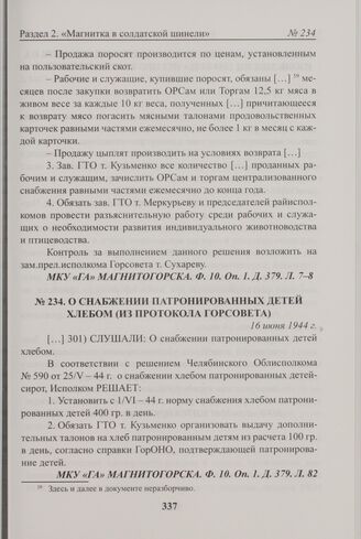 О снабжении патронированных детей хлебом (из протокола Горсовета). 16 июня 1944 г. // МКУ «ГА» Магнитогорска. Ф. 10. Оп. 1. Д. 379. Л. 82.