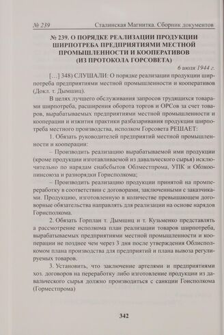 О порядке реализации продукции ширпотреба предприятиями местной промышленности и кооперативов (из протокола Горсовета). 6 июля 1944 г. // МКУ «ГА» Магнитогорска. Ф. 10. Оп. 1. Д. 379. Л. 156-157.