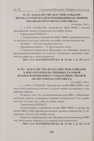 Ходатайство штаба ВВО ММК о выдаче хлебо-продовольственных талонов взамен похищенных стандартных справок (из протокола Горсовета). 16 ноября 1944 г.