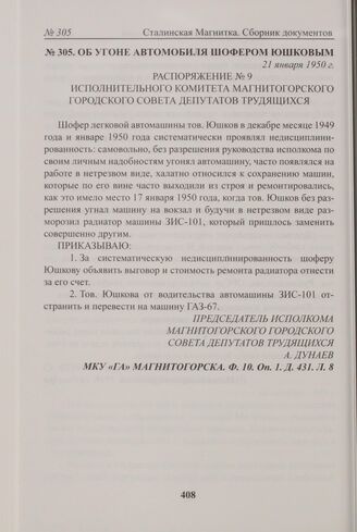 Главная Сталинская Магнитка. 1929-1950-е гг. Об угоне автомобиля шофером Юшковым. 21 января 1950 г.