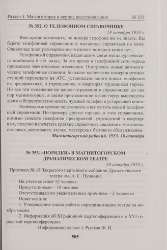Порядки в магнитогорском драматическом театре. 30 октября 1953 г. // ОГАЧО. Ф. 2942. Оп. 1. Д. 23. Л. 71-73.