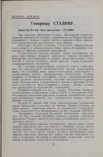 Первая сессия Верховного Совета Молдавской Советской Социалистической Республики первого созыва. Заседание первое (8 февраля 1941 года). Товарищу Сталину