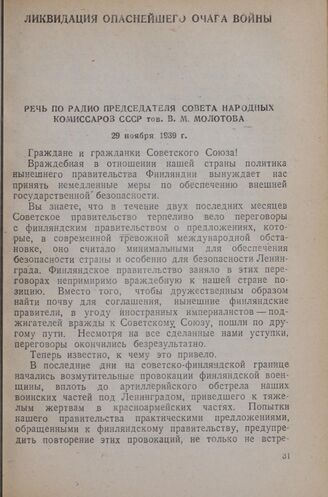 Речь по радио Председателя Совета Народных Комиссаров СССР тов. В. М. Молотова. 29 ноября 1939 г. // „Правда", 30 ноября 1939 г.