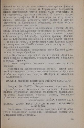 Красная Армия несет свободу и мир трудящимся Финляндии // "Ленинградская Правда", 1 декабря 1939 г.