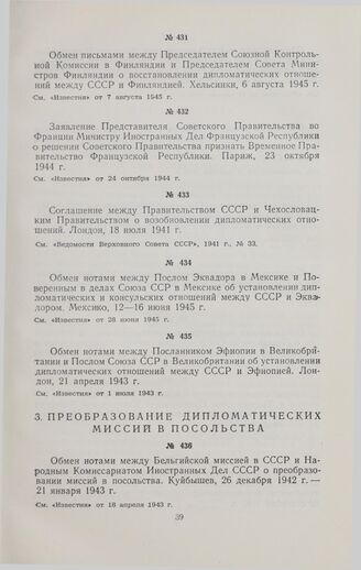 Обмен нотами между Посланником Эфиопии в Великобритании и Послом СССР в Великобритании об установлении дипломатических отношений. 21 апреля 1943 г. // «Известия» от 1 июля 1943 г.