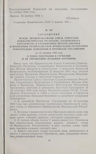 Соглашение относительно изменений в Протоколе Соглашения от 12 сентября 1944 г. о зонах оккупации в Германии и об управлении «Большим Берлином». 26 июля 1945 г.