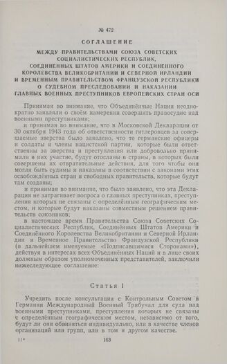 Соглашение между Правительствами Союза Советских Социалистических Республик, Соединенных Штатов Америки и Соединенного Королевства Великобритании и Северной Ирландии и Временным Правительством Французской Республики о судебном преследовании и наказании главных военных преступников европейских стран оси. Устав Международного военного трибунала. 8 августа 1945 г.
