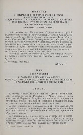 Соглашение о почтовом и посылочном обмене между Союзом Советских Социалистических Республик и Монгольской Народной Республикой. 10 октября 1944 г.