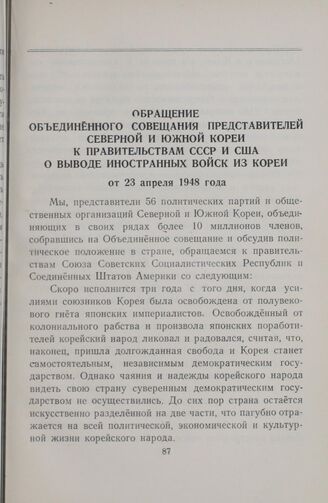 Обращение Объединенного совещания представителей Северной и Южной Кореи к правительствам СССР и США о выводе иностранных войск из Кореи от 23 апреля 1948 года