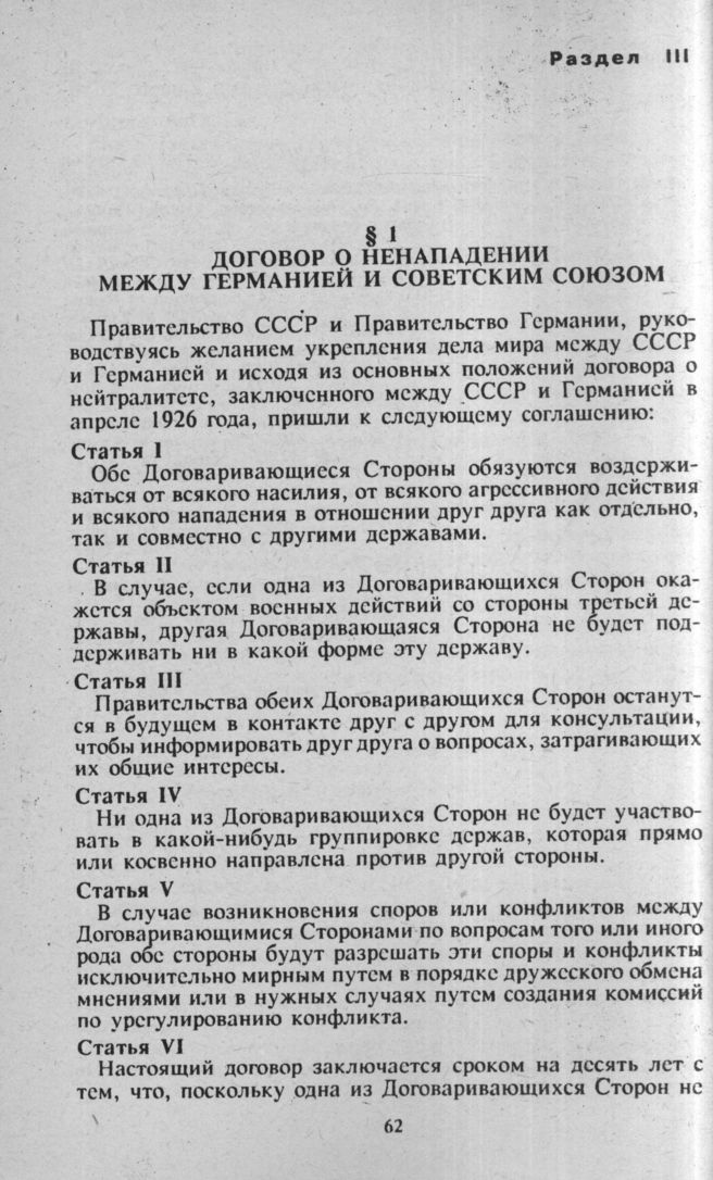 Договор о ненападении между Германией и Советским Союзом. § 1. 23 августа 1939 года