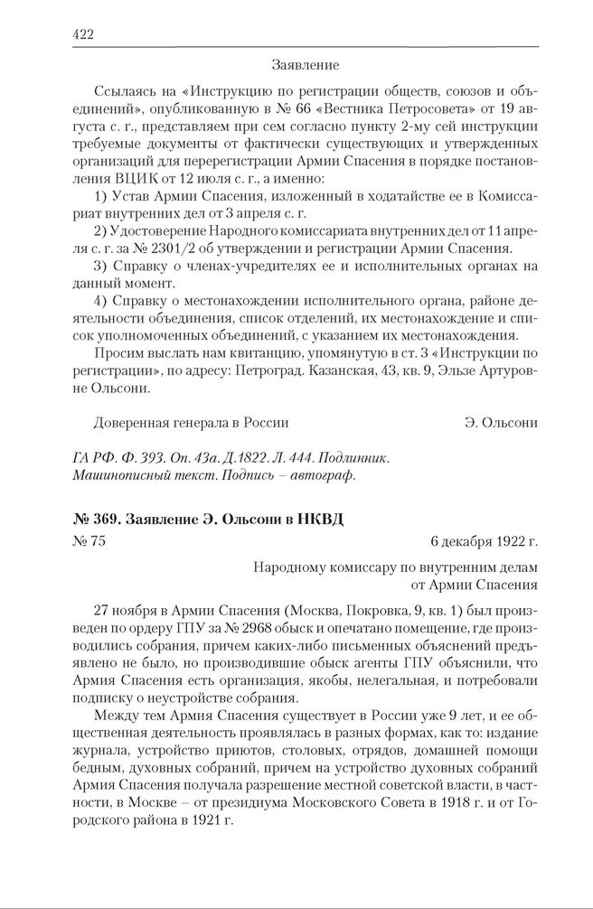 Заявление Э. Ольсони в НКВД РСФСР. 6 декабря 1922 г.