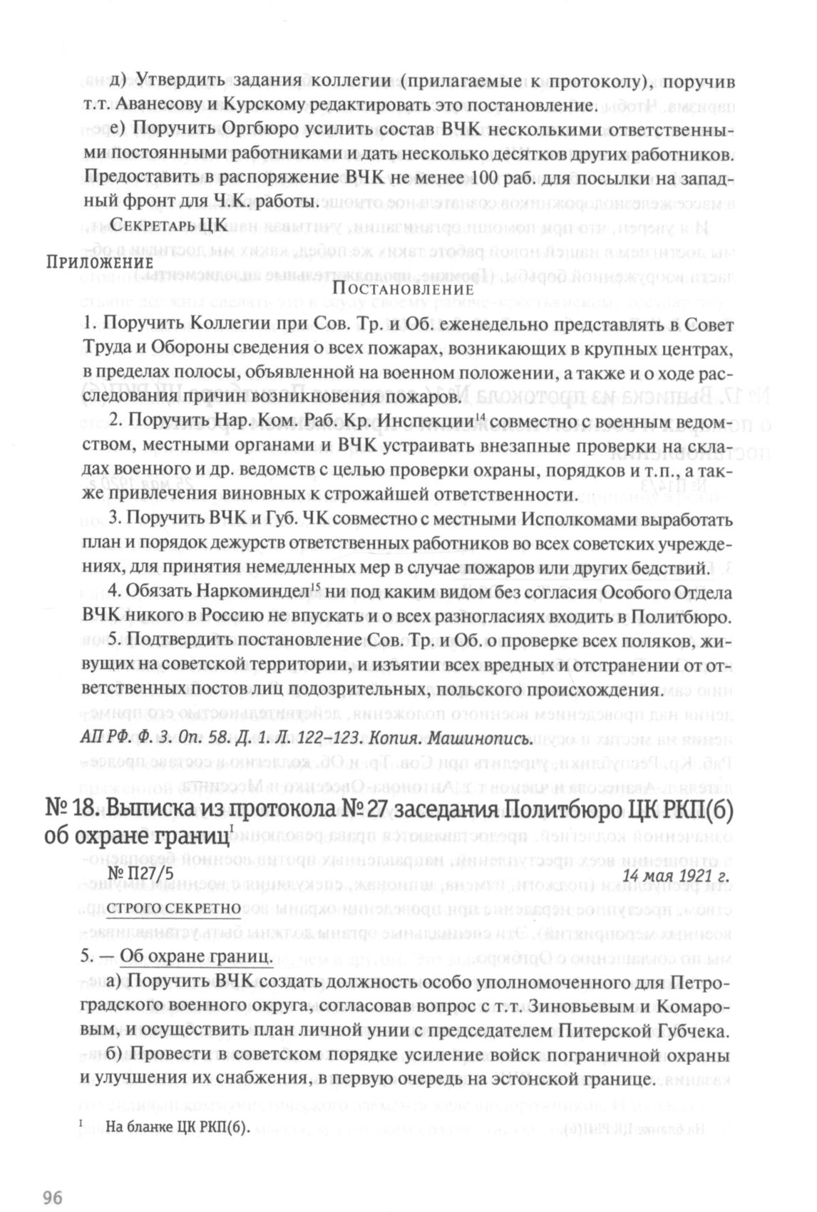 Выписка из протокола № 27 заседания Политбюро ЦК РКП(б) об охране границ. 14 мая 1921 г. // АП РФ. Ф. 3. Oп. 58. Д. 52. Л. 2. Копия. Машинопись.