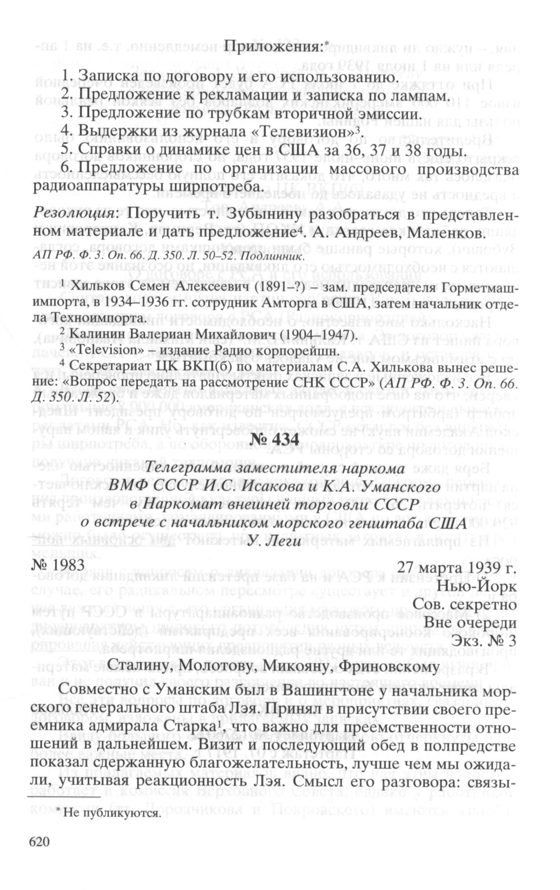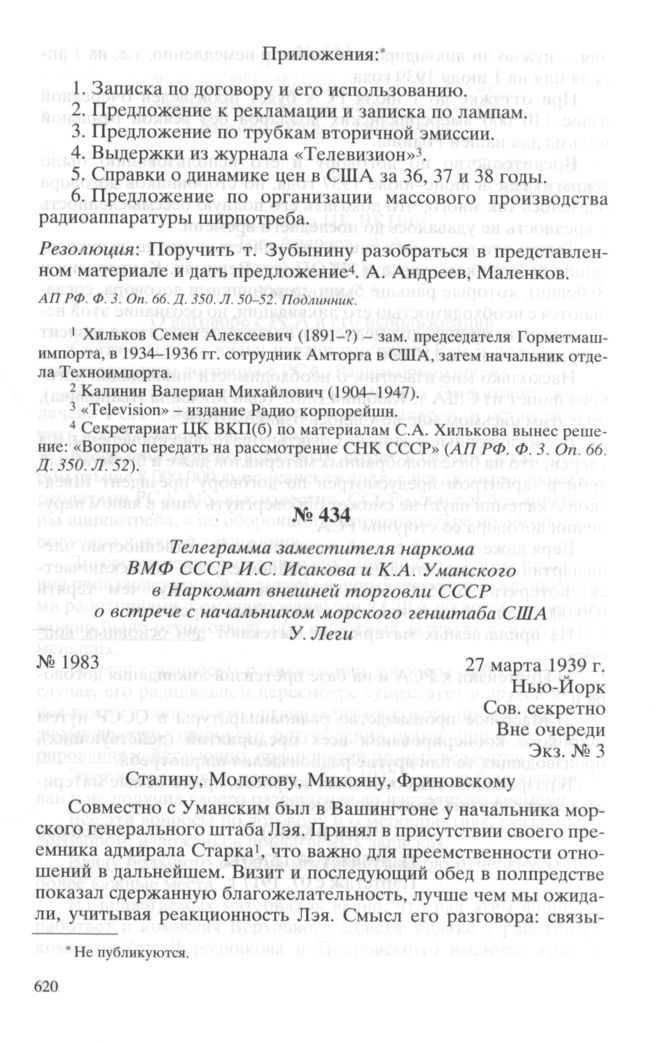 Телеграмма заместителя наркома ВМФ СССР И.С. Исакова и К.А. Уманского в Наркомат внешней торговли СССР о встрече с начальником морского генштаба США У. Леги. 27 марта 1939 г. // АП РФ. Ф. 3. Oп. 66. Д. 346. Л. 84. Заверенный дешифрант.